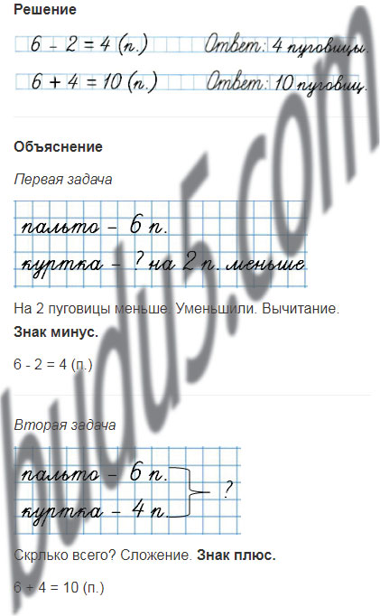 1. К пальто пришили 6 пуговиц, а к куртке — на 2 пуговицы меньше.