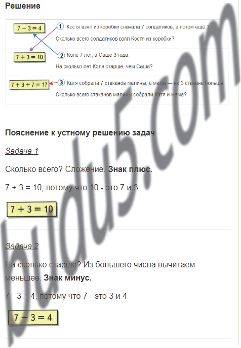 В нашем справочнике повтори тему "Больше. Меньше", состав числа 10 и числа 7, не забудь про табличное сложение.