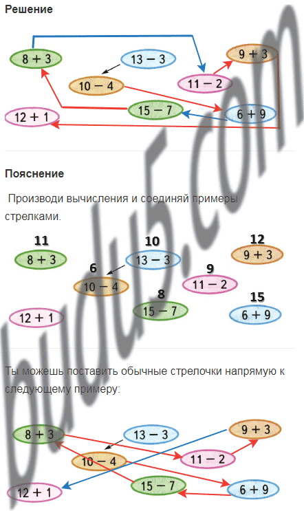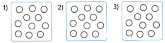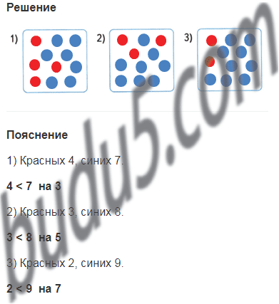 На каждом рисунке по 11 кружков. Раскрась каждый рисунок красным и синим карандашами так, чтобы красных кружков стало меньше, чем синих: на рисунке 1 — на 3 кружка, на рисунке 2 — на 5 кружков, на рисунке 3 — на 7 кружков.