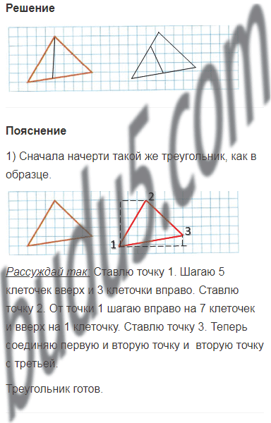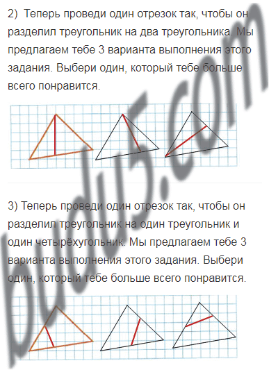 Начерти такой же треугольник. В каждом треугольнике проведи один отрезок так, чтобы он разделил первый треугольник на два треугольника, а второй — на один треугольник и один четырёхугольник.