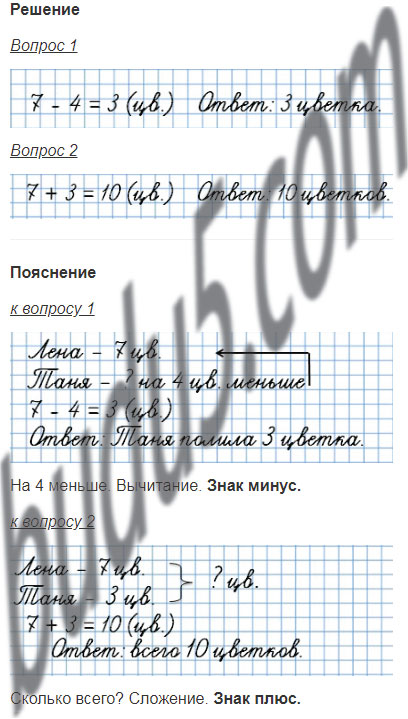 Лена полила 7 цветков, а Таня — на 4 цветка меньше. Сколько цветков полила Таня?