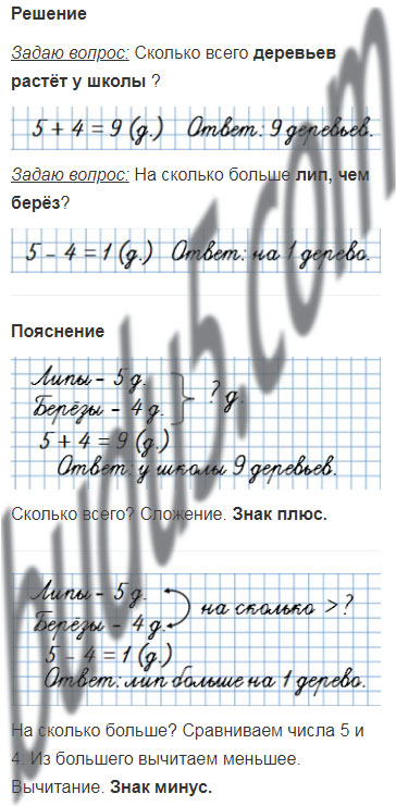 У школы растут 5 лип и 4 берёзы. Сколько всего ... ?