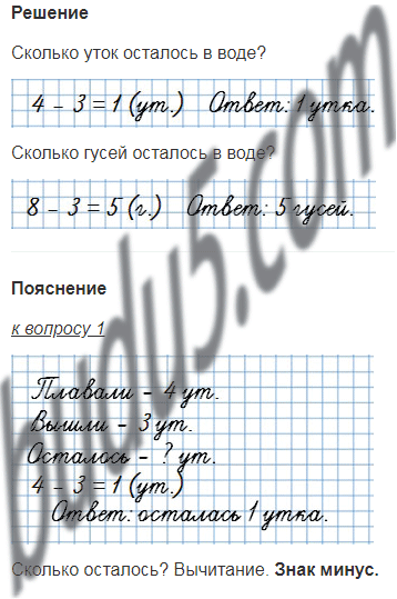 На пруду плавали 4 утки и 8 гусей. На берег вышли 3 утки и столько же гусей. Сколько уток и сколько гусей осталось в воде?