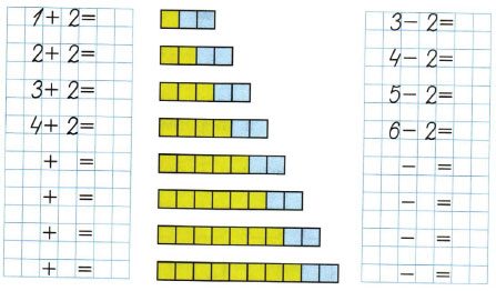 Повтори тему "Больше. Меньше", вспомни, как прибавить и вычесть число 2.