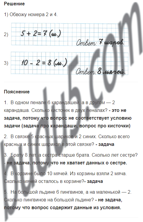 Найди две задачи. Обведи их номера. Реши каждую задачу.