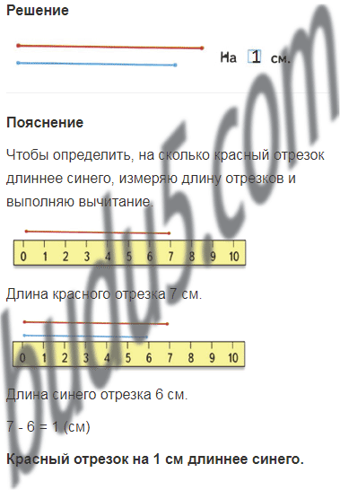 Определи, на сколько сантиметров красный отрезок длиннее синего.
