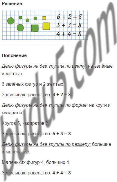 Разбей все фигуры на две группы по разным признакам. Запиши равенство для каждого случая.