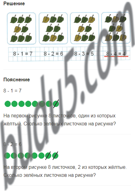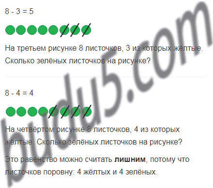 На рисунке 7 зелёных листочков и 1 жёлтый. Сколько всего листочков на рисунке? Тогда можно составить равенство 7 + 1 = 8 и рассуждать так же об остальных рисунках.