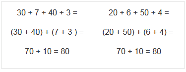 Удобно сначала к 7 прибавить 3, а к 30 прибавить 40, после чего полученные результаты сложить. Сумма чисел 7 и 3 равна 10. Сумма чисел 30 и 40 равна 70. К 70 прибавить 10 - получится 80.