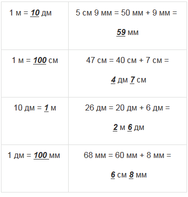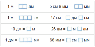 Повтори, сколько сантиметров в одном дециметре, сколько миллиметров в одном сантиметре, сколько дециметров в одном метре.