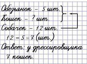 У дрессировщика в цирке столько обезьянок и кошек вместе, сколько собачек. Сколько кошек у дрессировщика, если у него 5 обезьянок и 12 собачек?