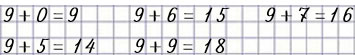 Среди чисел 9, 19, 14, 15, 18, 21, 16 сначала подчеркни те, которые можно представить как сумму однозначных слагаемых, а затем запиши их в виде суммы, в которой одно слагаемое равно 9.
