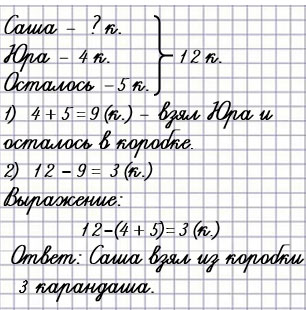 В коробке было 12 карандашей. После того как из коробки несколько карандашей взял Саша и 4 карандаша взял Юра, в коробке осталось 5 карандашей. Сколько карандашей из коробки взял Саша?