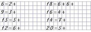 Закончи записи, заменяя каждое число суммой одинаковых слагаемых.