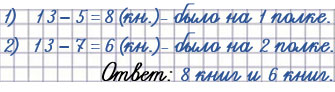 Когда на верхнюю полку поставили ещё 5 книг, а на нижнюю - 7 книг, на каждой полке стало по 13 книг. Сколько книг было на каждой полке сначала?