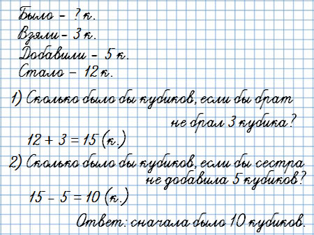 2) 15 - 5 = 10 (к.) - было бы, если сестра не добавляла 5 кубиков в коробку.