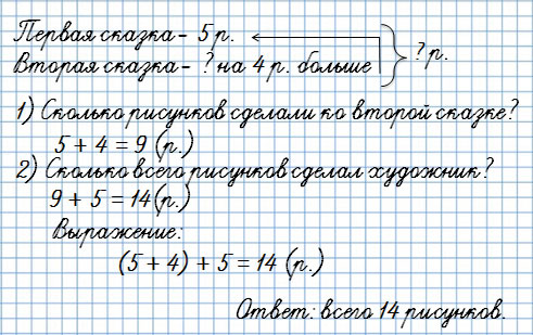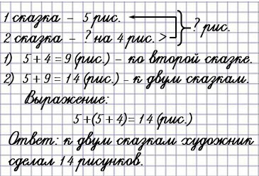 К одной сказке художник сделал 5 рисунков, а к другой — на 4 рисунка больше. Сколько всего рисунков художник сделал к этим двум сказкам?