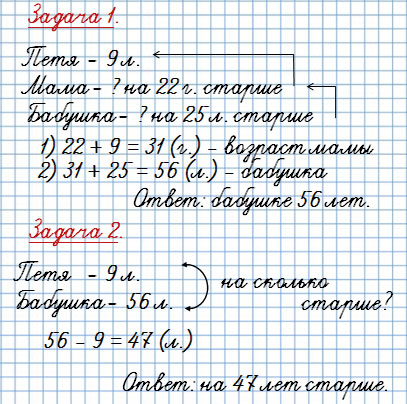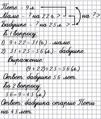 Пете 9 лет. Мама на 22 года старше Пети, а бабушка на 25 лет старше мамы. Сколько лет бабушке?