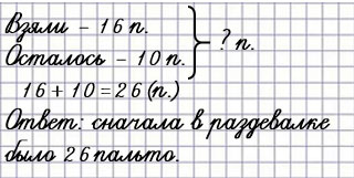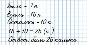 После того как из раздевалки взяли 16 пальто, там осталось 10 пальто. Сколько пальто было в раздевалке сначала?