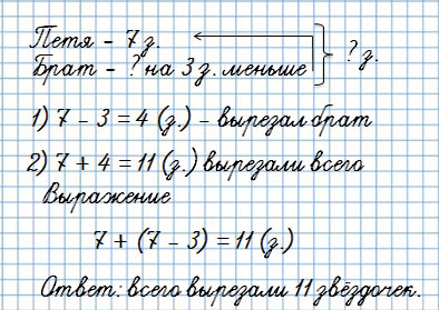 Петя вырезал из цветной бумаги 7 звёздочек, а его брат — на 3 звёздочки меньше. Сколько всего звёздочек вырезали эти мальчики?