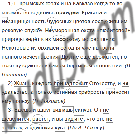 1) В Крымских горах и на Кавказе когда-то во множестве водились орхидеи. Красота и (не) защищённость чудесных цветов сослужили им роковую службу. (Не) умеренная охота «любителей» природы ведёт к их ма(с, сс)овому истреблению. Некоторые из орхидей сегодня уже на грани полного и..чезновения. Другие ещё держ..тся но тоже нуждаются в са́мом бережном отношении. (В. Ветлина)