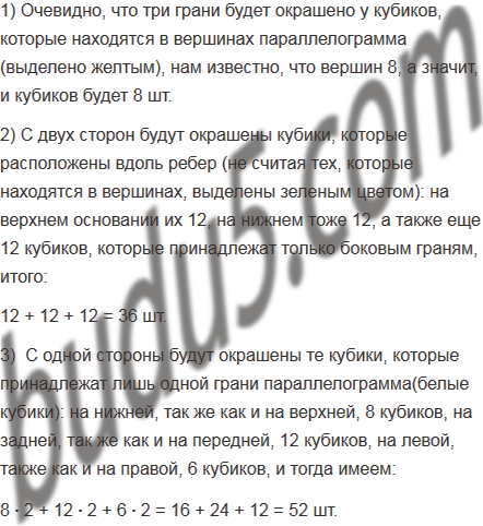 Брусок, имеющий форму прямоугольного параллелепипеда с измерениями 4 см, 5 см и 6 см, покрасили со всех сторон и разрезали на кубики с ребром 1 см. Сколько получилось кубиков, у которых окрашено: 1) три грани; 2) две грани; 3) одна грань?