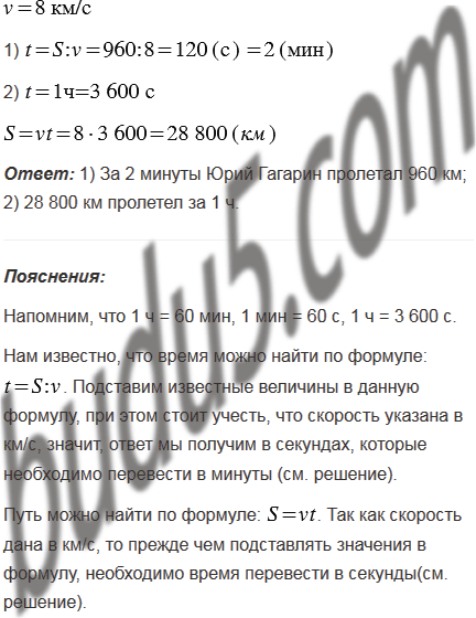 Скорость космического корабля "Восток", на котором Юрий Гагарин совершил свой полёт, равна 8 км/с. 1) За сколько минут он пролетал 960 км? 2) Какое расстояние он пролетел за 1 ч?