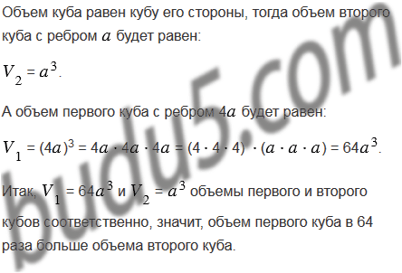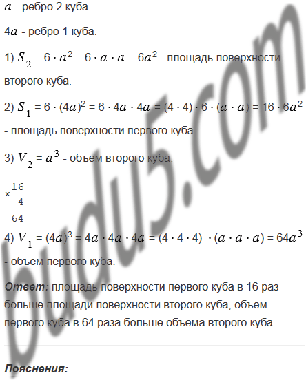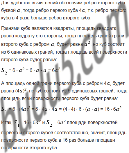 Ребро одного куба в 4 раза больше ребра второго. Во сколько раз: 1) площадь поверхности первого куба больше площади поверхности второго; 2) объем первого куба больше объема второго?
