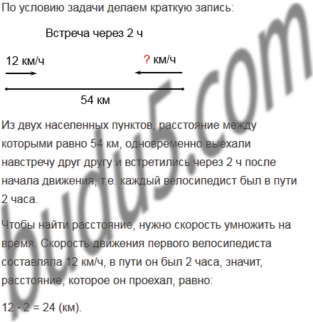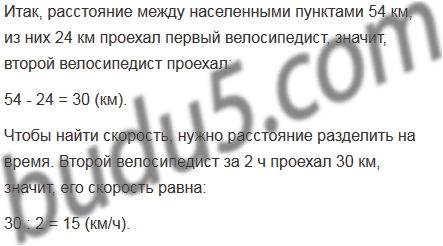 Из двух населенных пунктов, расстояние между которыми равно 54 км, одновременно выехали навстречу друг другу и встретились через 2 ч после начала движения. Скорость движения первого велосипедиста составляла 12 км/ч. С какой скоростью двигался второй велосипедист?