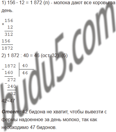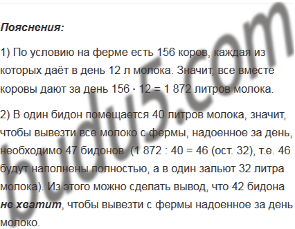 На ферме есть 156 коров, каждая из которых даёт в день 12 л молока. Молоко с фермы вывозят в бидонах ёмкостью 40 л. В некоторый день на ферме было в наличии 42 пустых бидона. Хватит ли бидонов, чтобы вывезти с фермы надоенное за день молоко?