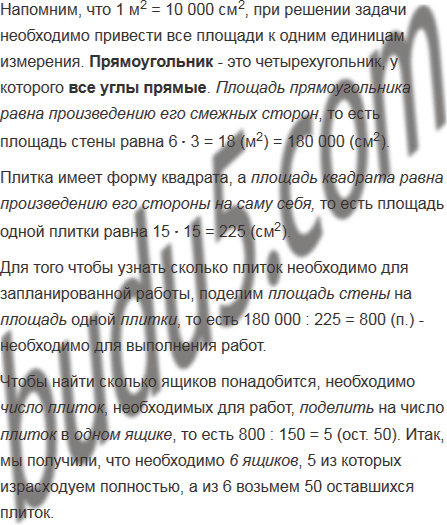 Стену длиной 6 м и высотой 3 м хотят выложить кафелем. Одна кафельная плитка имеет форму квадрата со стороной 15 см, а в одном ящике - 150 плиток. Какое наименьшее количество ящиков с кафелем надо приобрести для запланированной работы?
