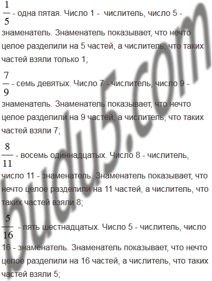 Прочитайте дроби: ; ; ; ; ; . Назовите числитель и знаменатель каждой дроби и поясните, что они означают.