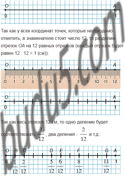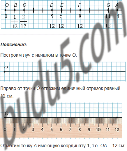 Начертите координатный луч, единичный отрезок которого равен 12 см. Отметьте на нём точки, соответствующие дробям: ; ; ; ; ; .