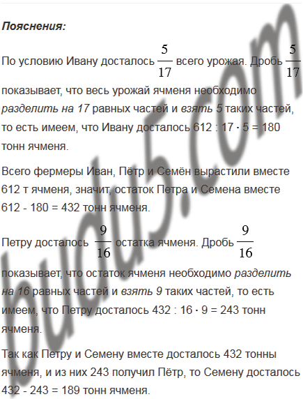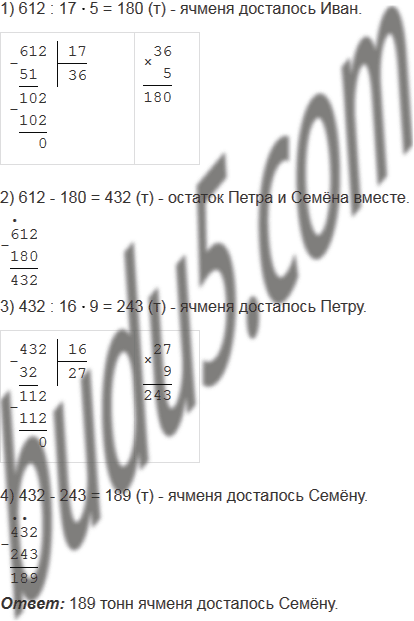 Фермеры Иван, Пётр и Семён вырастили вместе 612 т ячменя и поделили урожай между собой. Ивану досталось