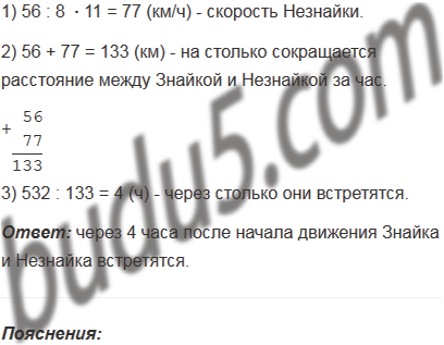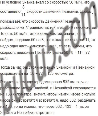 скорости движения Незнайки. Через сколько часов после начала движения они встретятся, если расстояние между городами равно 532 км?