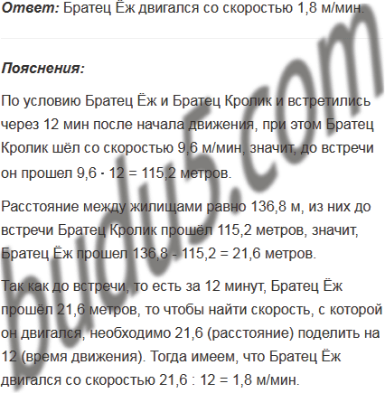 Из своих жилищ навстречу друг другу одновременно вышли Братец Ёж и Братец Кролик и встретились через 12 мин после начала движения. С какой скоростью двигался Братец Ёж, если расстояние между их жилищами равно 136,8 м, а Братец Кролик шёл со скоростью 9,6 м/мин?