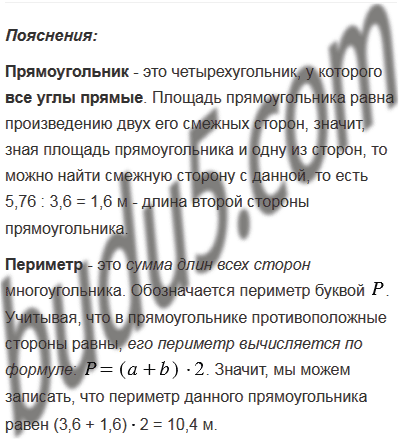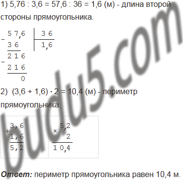 Площадь прямоугольника равна 5,76 м2, а одна из его сторон - 3,6 м. Вычислите периметр прямоугольника.