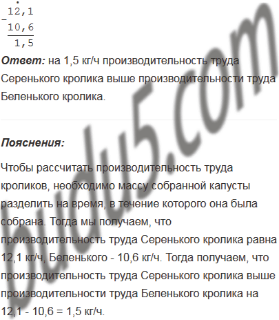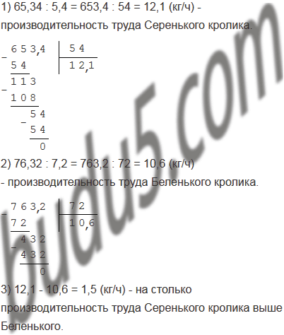 Кролики Серенький и Беленький собирали капусту. Серенький собрал 65,34 кг за 5,4 ч, а Беленький - 76,32 кг за 7,2 ч. У кого из кроликов производительность труда (количество собранной капусты за 1 час) выше и на сколько килограммов?