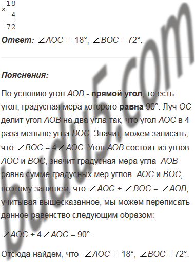 Луч ОС делит прямой угол АОВ на два угла так, что угол АОС в 4 раза меньше угла ВОС. Найдите градусные меры углов АОС и ВОС.