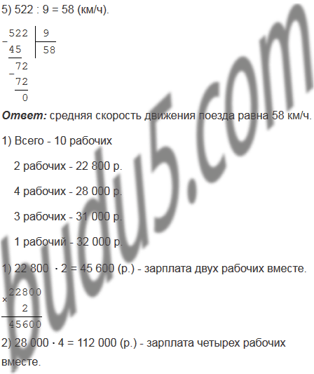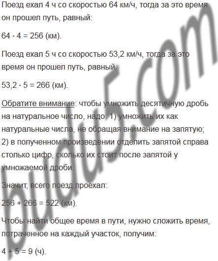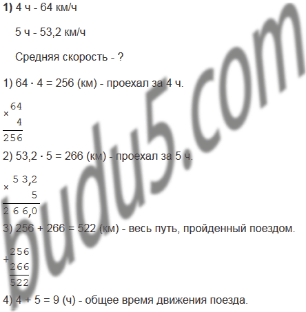 1) Поезд ехал 4 ч со скоростью 64 км/ч и 5 ч со скоростью 53,2 км/ч. Найдите среднюю скорость поезда на протяжении всего пути.