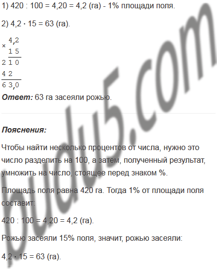 Площадь поля равна 420 га. Рожью засеяли 15% поля. Сколько гектаров засеяли рожью?