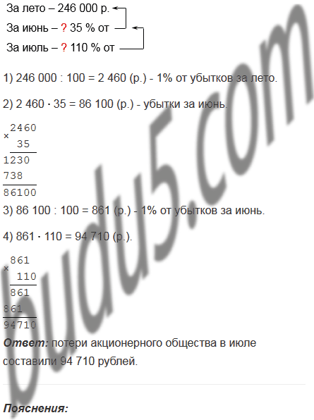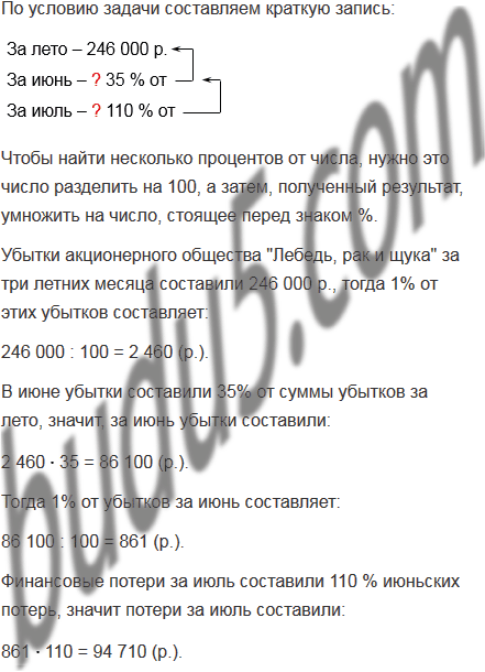 Убытки акционерного общества "Лебедь, рак и щука" за три летних месяца составили 246 000 р. В июне убытки составили 35% этой суммы, а финансовые потери за июль составили 110 % июньских потерь. Сколько рублей составили потери акционерного общества в июле?