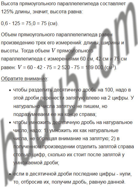 Длина прямоугольного параллелепипеда равна 60 см, его ширина составляет 70% длины, а высота - 125% длины. Вычислите объем прямоугольного параллелепипеда.