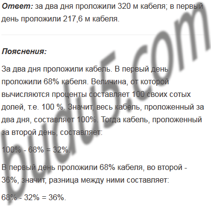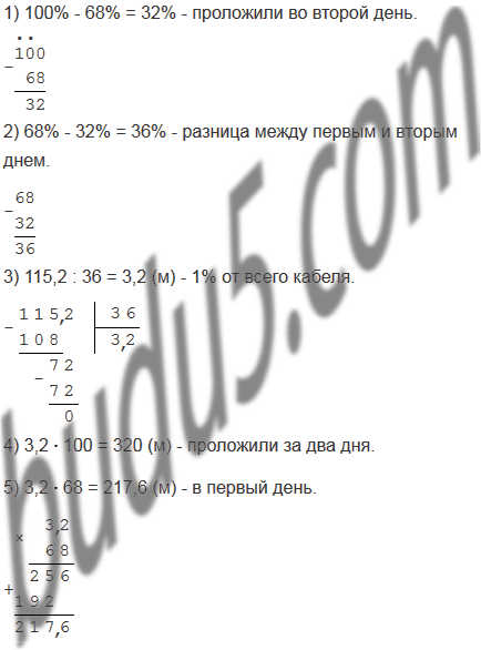 За два дня проложили кабель. В первый день проложили 68% кабеля, а во второй - на 115,2 м меньше, чем в первый. Сколько всего метров кабеля проложили за два дня? Сколько метров кабеля проложили в первый день?