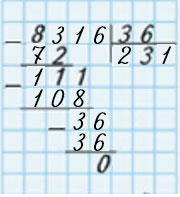 После того, как разделили первое неполное делимое, получился остаток 11. В первом неполном делимом - 8 десятков. 8 - 1 = 7. Значит, получилось разделить число 72. 72 : 36 = 2.