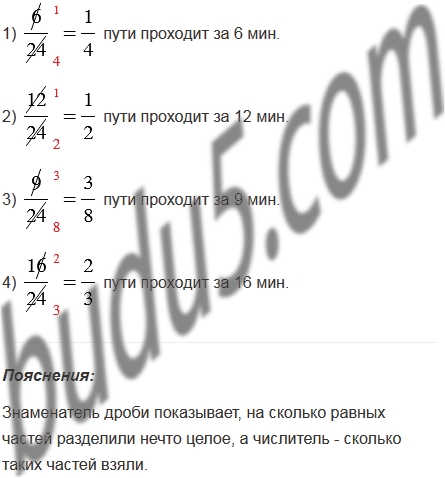 Андрей тратит на путь от дома до школы 24 мин. Какую часть пути он проходит: за 6 мин; за 12 мин; за 9 мин; за 16 мин?