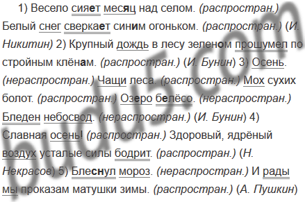 1) Весело сия..т мес..ц над селом. Белый снег сверка..т син..м огоньком. (И. Никитин) 2) Крупный дождь в лесу зелен..м прошумел по стройным клён..м. (И. Бунин) 3) Осень. Чащи леса. Мох сухих болот. Оз..ро б..лёсо. Бледен небосвод. (И. Бунин) 4) Славная осень! Здоровый, ядрёный воздух усталые силы бодрит. (Н. Некрасов) 5) Блес(?)нул мороз. И рады мы проказам матушки зимы. (А. Пушкин)