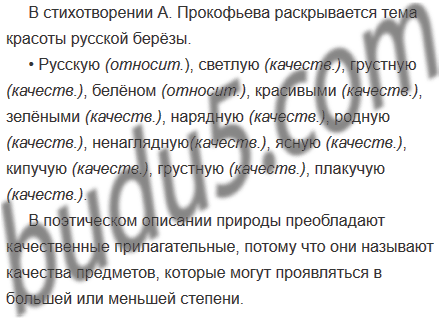• Выпишите имена прилагательные, с помощью которых создан образ берёзы, определите их разряд. Прилагательные какого разряда преобладают в поэтическом описании природы? Как вы думаете, почему?
