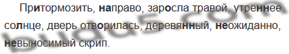 Пр..тормозить, (на)право, зар..сла травой, утре(н, нн)ее со(?)нце, дверь отв..рилась, деревя(н, нн)ый, (не)ожиданно, (не)выносимый скрип.