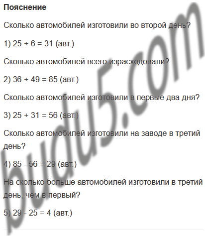 Задание № 6. На заводе за 3 дня изготовили 36 голубых и 49 красных автомобилей. В первый день изготовили 25 автомобилей, а во второй день - на 6 автомобилей больше, чем в первый. Сколько автомобилей изготовили на заводе в третий день? На сколько больше автомобилей изготовили в третий день, чем в первый?